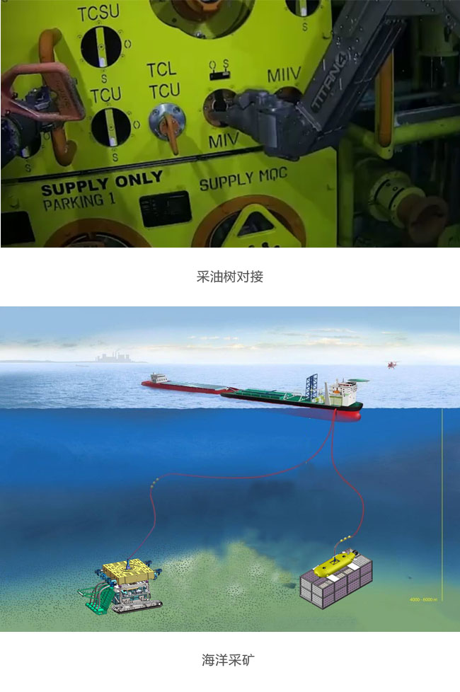 深海勘探、深海矿藏开采、导管架检修、管线铺设、阀门对接等